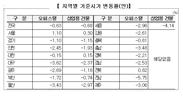 공개된 기준시가(안)에 따르면, 오피스텔은 전년 대비 0.6% 하락, 상업용 건물은 0.7% 하락한 것으로 나타났다. 다만 서울 지역은 오피스텔 1.1%, 상업용 건물 0.3% 상승하며 다른 지역과 상반된 흐름을 보였다.