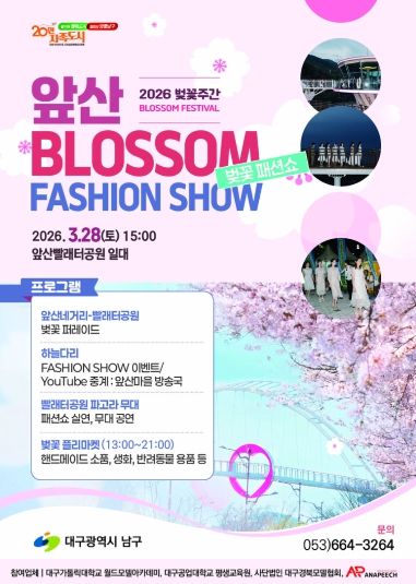 이번 행사는 벚꽃 개화 시기에 맞춰 특설무대와 앞산해넘이전망대, 하늘다리 일대에서 진행되며, 전문 모델과 시민들이 함께 참여하는 패션쇼와 플리마켓 등 다양한 프로그램이 마련된다.