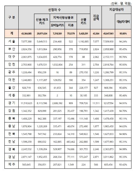 행정안전부는 ‘2차 민생회복 소비쿠폰’ 지급이 시작된 이후 4주간(9월 22일~10월 19일), 지급 대상자의 95.0%에 해당하는 4,336만 명이 신청을 완료했고, 총 4조 3,364억 원이 지급됐다고 밝혔다.