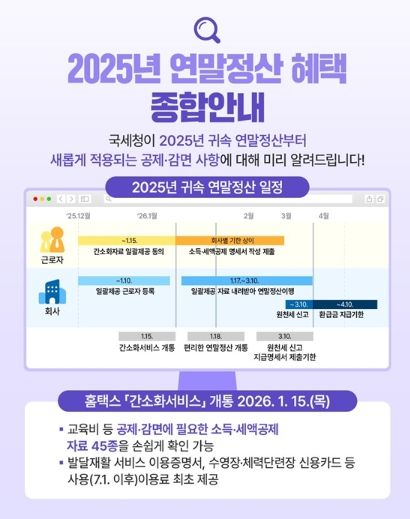 국세청이 2025년 귀속분부터 적용되는 연말정산 세제 혜택 변경사항을 발표했다. 올해는 자녀양육·주거·생활비·기부금 등 서민 체감도가 높은 항목 중심으로 공제폭이 확대됐다.