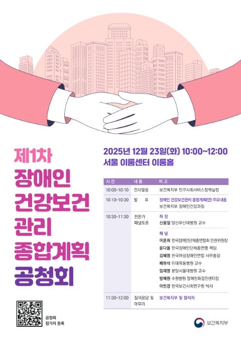 보건복지부는 12월 23일 오전 10시 서울 여의도 이룸센터에서 ‘제1차 장애인 건강보건관리 종합계획(안)’ 공청회를 개최했다. 이번 공청회는 향후 5년간 장애인 건강정책의 방향을 설정하기 위한 공식 의견수렴 절차다.