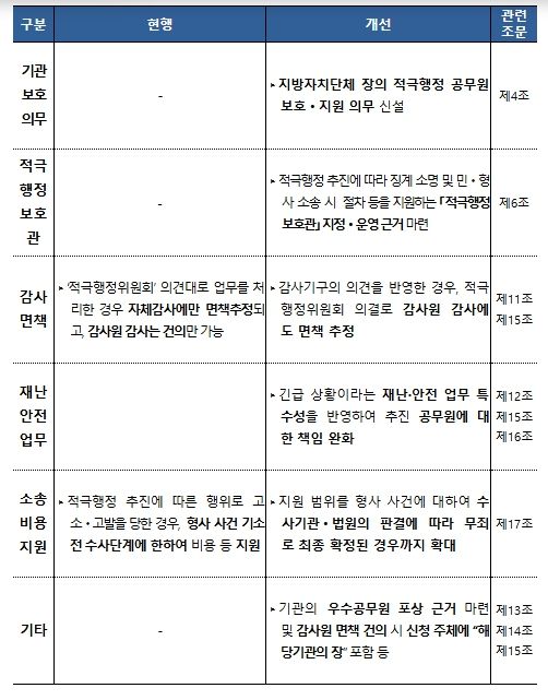이에 따라 적극행정 공무원은 책임 문제가 발생했을 때 법률 자문, 변호사 선임, 소송 비용 지원, 수사기관에 제출하는 의견서 작성 등 실질적인 도움을 받을 수 있게 된다.