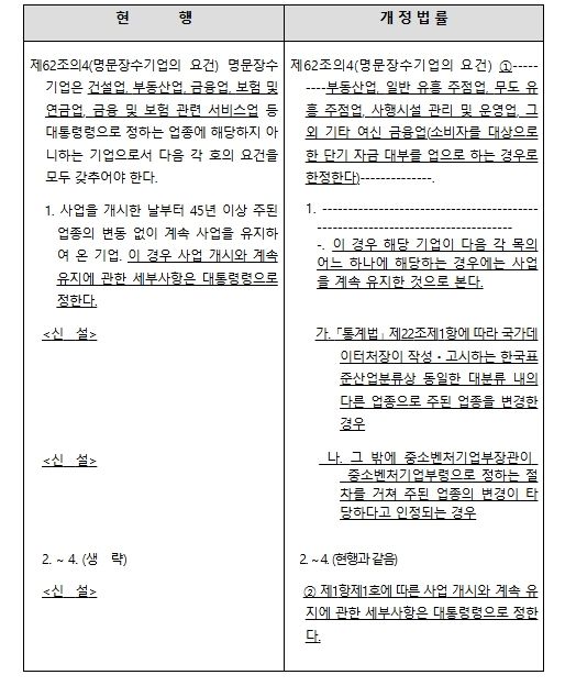 개정안은 이에 따라 ‘주된 업종 유지 기준’을 기존 세분류에서 대분류로 완화하고, 대분류 간 업종 변경이 있더라도 중기부가 정하는 절차를 거쳐 타당성이 인정될 경우 기존 업종을 유지한 것으로 인정하도록 했다.