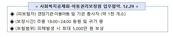또한 오는 29일에는 사회복지공제회와 아동권리보장원이 업무협약을 체결해, 야간 연장돌봄 이용 아동과 종사자를 대상으로 보험 가입 등 안전 지원을 추진할 예정이다.