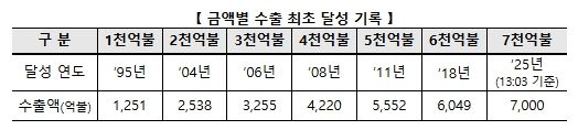 이번 성과는 2018년 6,000억 달러 달성 이후 7년 만에 이룬 쾌거로, 전 세계에서 여섯 번째로 7,000억 달러 수출을 달성한 국가 반열에 올랐다.