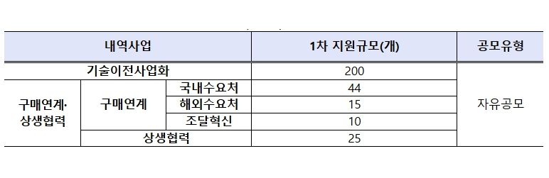 세부적으로는 ▲기술이전사업화(1단계 PoC·PoM)에 200억 원(200개 과제) ▲구매연계·상생협력 분야에 **201억 원(94개 과제)**이 각각 투입된다.