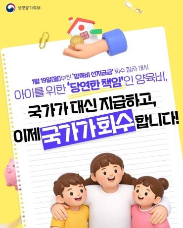 아이를 키우는 데 필요한 양육비는 선택이 아닌 책임이다. 정부가 양육비를 받지 못한 양육자를 대신해 먼저 지급하고, 이후 비양육자에게 회수하는 **‘양육비 선지급금 회수 절차’**가 본격적으로 시작됐다.