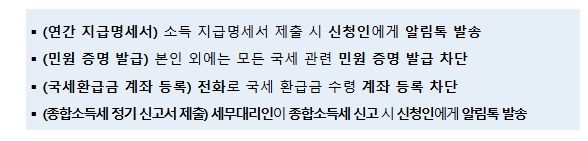 해당 서비스는 홈택스 또는 세무서 방문을 통해 1월 20일부터 신청 가능하며, 업무별로 전부 또는 일부를 선택해 차단 설정할 수 있다.