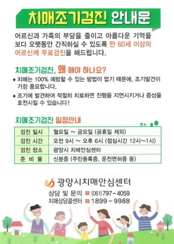 치매 검진 절차와 검사비 지원 등 자세한 사항은 광양시치매안심센터를 통해 안내받을 수 있다.