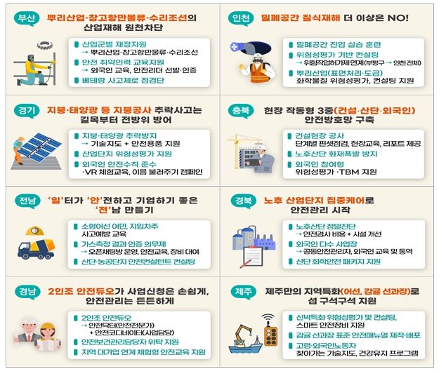 지방정부들은 ▲안전관리자 선임이 어려운 소규모 사업장 대상 공동안전관리자 지원, ▲어선·농축산업 등 기존 제도의 사각지대 업종 지원, ▲조선·뿌리산업 등 사고다발 업종 집중관리, ▲외국인 노동자 등 안전 취약계층 보호 강화 등 지역 맞춤형 중대재해 예방사업을 추진한다.