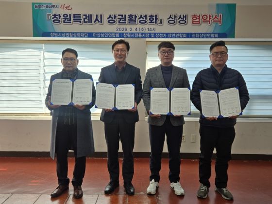 창원시상권활성화재단은 2월 4일 오후 2시, 재단 어울림센터에서 마산통합상인연합회, 창원시 전통시장 및 상점가 상인연합회, **진해상인연합회(대표시장: 진해중앙시장)**와 함께 **‘창원특례시 상권활성화’를 위한 상생 업무협약(MOU)**을 체결했다.