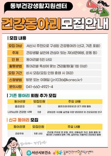 건강동아리 모집과 관련한 자세한 사항은 서산시 동부건강생활지원센터로 문의하면 된다.