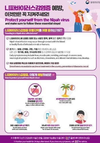 또한 의료기관에는 니파바이러스 감염증 발생 국가 방문 이력이 있는 환자가 관련 증상을 보일 경우, 즉시 관할 보건소로 신고할 것을 요청했다.