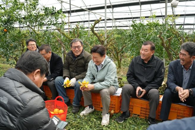오영훈 제주도지사는 11일 제주시 아라동 한라봉 재배 농가를 찾아 수확 현장을 점검하고 간담회를 진행했다.