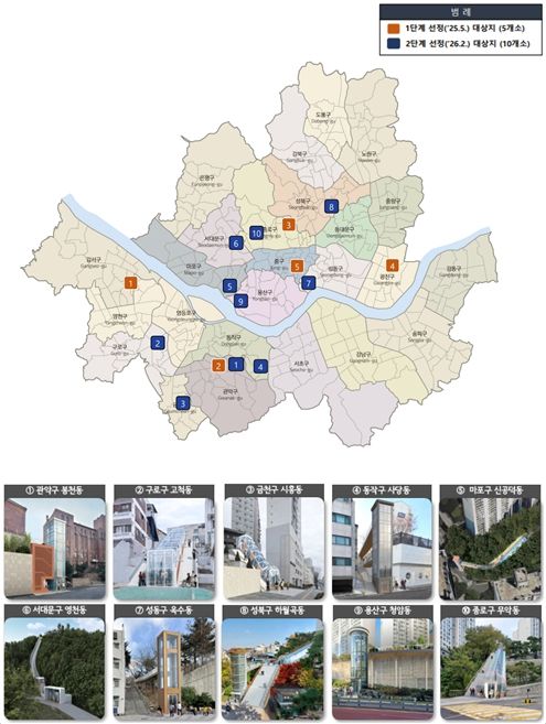 이번 2단계 사업은 지난해 9월 시민 공모를 시작으로 자치구 검토, 현장 조사, 수요 분석을 거쳐 최종 대상지가 결정됐다. 총 55곳의 후보지 가운데 경사도 30% 이상의 급경사 계단 지역을 중심으로 생활 동선 개선 효과와 이용 수요를 종합 평가해 10곳이 선정됐다.