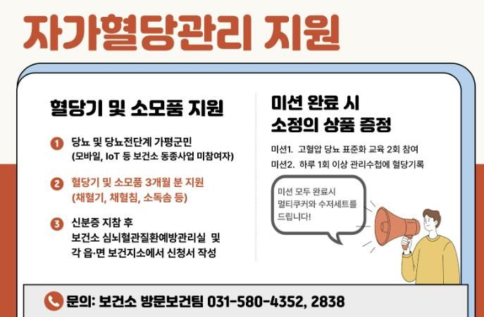 자가혈당 관리 지원사업 참여를 희망하는 주민은 가평군보건소 심뇌혈관질환예방관리실 또는 가까운 보건지소로 문의하면 된다.