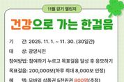비즈데일리 이정아 기자 | 광양시는 지역 주민의 건강생활 실천을 돕기 위해 11월 1일부터 30일까지 모바일 걷기 앱 '워크온'에서 ‘건강으로 가는 한걸음 11월 걷기 챌린지’를 운영한다고 밝혔다. 이번 걷기 챌린지는 1걸음당 1마일리지가 적립되며, 1일 최대 8천 마일리지가 누적된다. 기간 중 20만 보를 달성하면 20만 마일리지가 쌓여 모바일상품권(5천 원권) 응모가 가능하다. 시는 목표 걸음을 달성한 참여자 중 추첨을 통해 800명에게 상품권을 지급할 예정이다. 참여를 희망하는 시민은 모바일 걷기 앱 ‘워크온’을 설치하고 ‘광양시 공식 커뮤니티’에 가입한 뒤, 챌린지 탭에서 광양시 걷기 챌린지 참여하기를 누르고 목표 마일리지가 쌓일 때까지 스마트폰을 소지하고 걸으면 된다. 광양 지역 제한이 설정되어 있어 참여 시 휴대폰 위치 설정을 반드시 켜야 하며, 자세한 사항은 광양시보건소로 문의하면 된다. 반미순 건강증진과장은 “걷기는 체력 증진은 물론 스트레스 해소에도 큰 도움이 된다”며 “걷기 좋은 계절인 가을, 시민 여러분의 많은 참여를 바란다”고 말했다. 한편