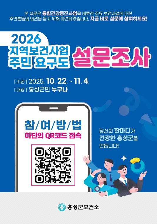 홍성군보건소가 주민의 건강 요구를 반영한 맞춤형 보건정책 수립을 위해 **‘지역보건사업 주민 요구도 설문조사’**를 오는 22일부터 2주간 실시한다.