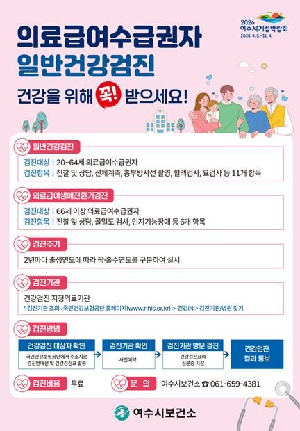 여수시에 따르면, 20세 이상 64세 이하 의료급여수급권자는 2년마다 생년 연도 기준으로 짝·홀수 연도에 따라 건강검진을 받을 수 있다. 올해는 홀수년도 출생자가 대상이며, 신체계측, 혈액검사, 구강검진 등 주요 항목을 전액 무료로 받을 수 있다.