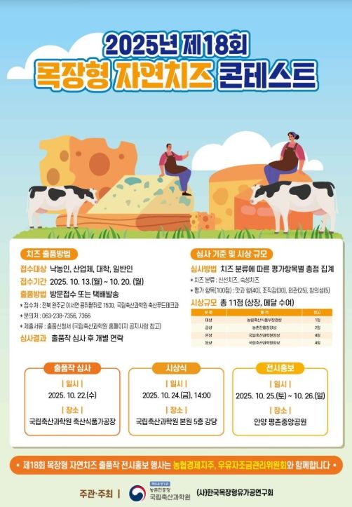농촌진흥청이 주최한 **‘제18회 목장형 자연치즈 경진대회’**가 10월 22일부터 24일까지 국립축산과학원에서 성황리에 막을 내렸다. 이번 대회는 국내산 치즈의 품질 향상과 소비 촉진을 목표로 지난 2006년부터 매년 개최되고 있다.
