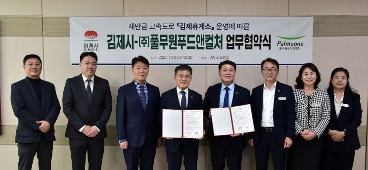 김제시가 오는 11월 21일 개장을 앞둔 ‘김제휴게소’ 운영과 관련해 ㈜풀무원푸드앤컬처와 손을 잡았다. 시는 27일 시청에서 양 기관이 참여한 가운데 업무협약을 체결하고, 새만금-전주 고속도로 개통에 발맞춰 지역경제 활성화에 나서기로 했다.