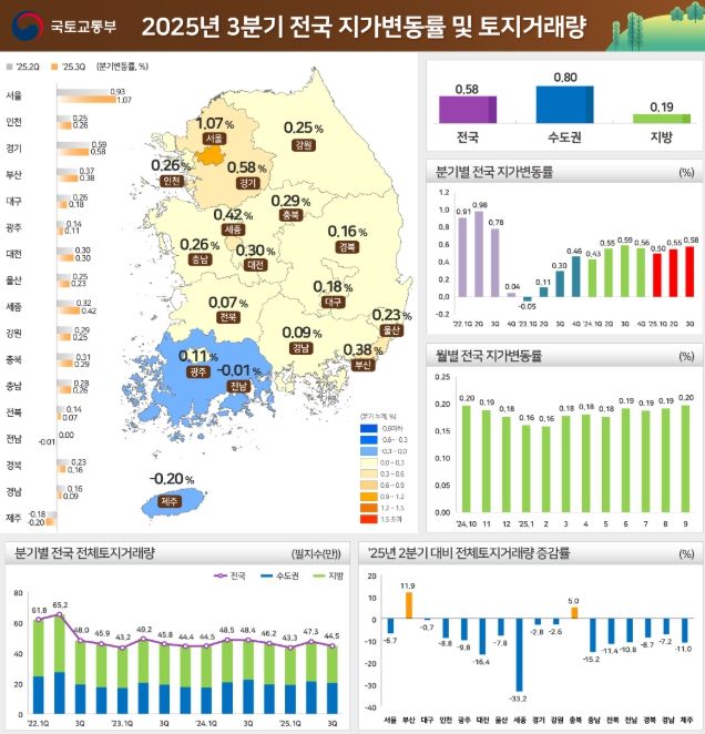 국토교통부와 한국부동산원(원장 손태락)은 2025년 3분기 전국 지가변동률과 토지거래량을 발표하며,