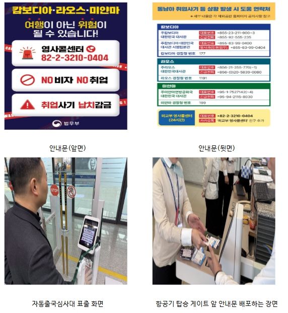 또한 유인 출국심사대를 이용하는 국민에게는 출입국관리공무원이 직접 ‘캄보디아·라오스·미얀마 방문 주의 안내문’을 배포한다.