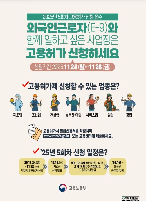 고용노동부가 올해 다섯 번째 외국인근로자(E-9) 신규 고용허가 신청을 오는 11월 24일부터 28일까지 전국 지방고용노동관서에서 접수한다.