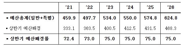 기획재정부 관계자는 “상반기 조기 배정은 경기 대응력과 재정 집행 효율성을 높이는 핵심 수단”이라며 “집행 점검체계를 강화해 예산이 현장에 제때 투입되도록 할 것”이라고 밝혔다.
