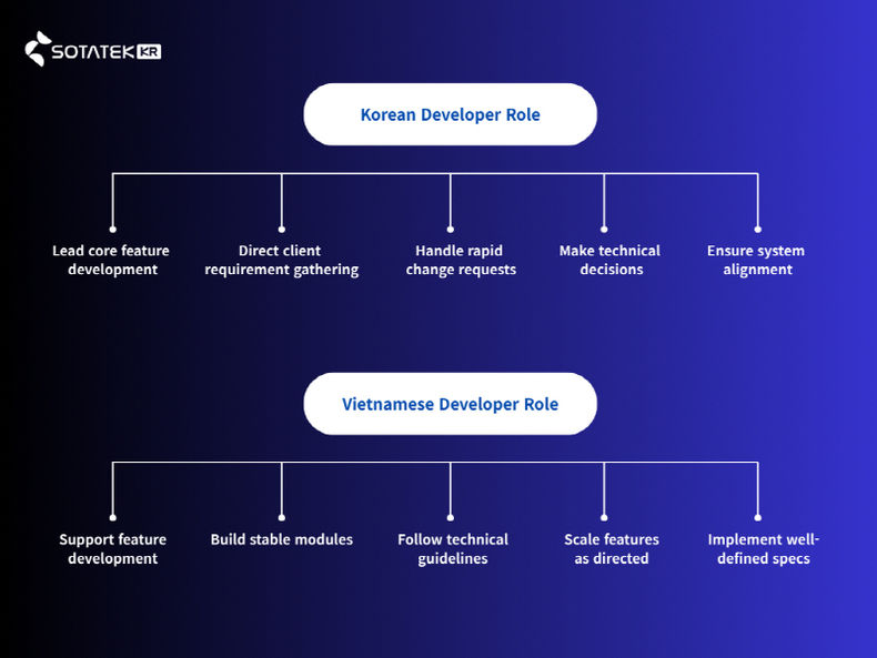 반면, 베트남 개발팀은 **확장 팀(extended team)**으로서 안정적인 모듈 개발과 명확한 기능 구현에 집중한다.