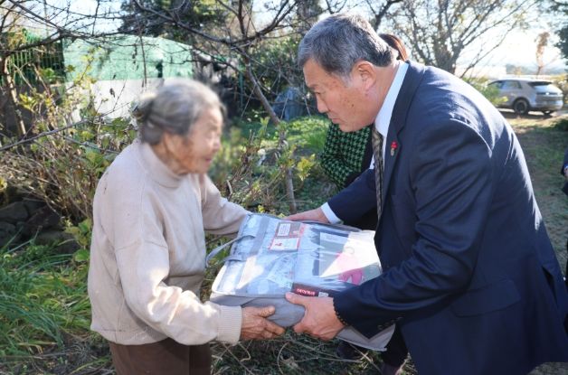 이날 김 시장은 제주도사회복지공동모금회의 후원으로 제주지역화폐 ‘탐나는전’을 전달하고, 한국에너지공사에서 지원한 전기매트를 함께 전달하며 어르신이 따뜻하고 안전하게 겨울을 보낼 수 있도록 격려했다.