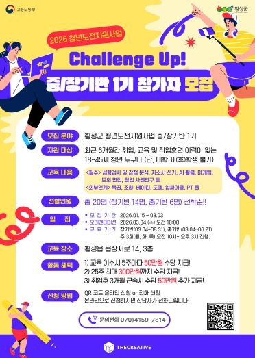 횡성군이 지역 청년들의 사회 진출을 돕기 위한 ‘2026 청년도전지원사업’ 참여자를 모집한다. 이번 사업은 고용노동부가 주관하고 횡성군이 주최, ㈜더크리에이티브가 운영을 맡는다.