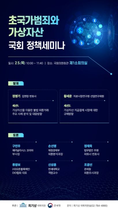 최 의원은 “가상자산이 초국가범죄의 새로운 통로로 진화하고 있다는 점은 더 이상 부인하기 어려운 현실”이라며 “이번 논의가 안전하고 투명한 가상자산 거래 질서를 만드는 출발점이 되길 바란다”고 말했다.