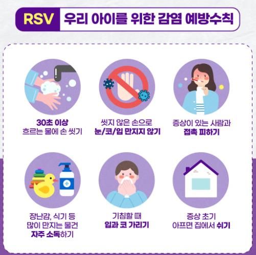 아울러 손 씻기와 기침예절 준수, 마스크 착용, 실내 환기 등 기본적인 감염병 예방수칙을 생활화해 줄 것을 강조했다. 현재 RSV 감염증은 별도의 치료제가 없어 증상 완화를 중심으로 한 대증요법이 주된 치료 방법이다.