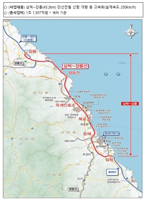 삼척시~강릉시 구간은 동해선축의 마지막 저속 구간으로, 이번 예타 통과로 동해선 전 구간 고속철도망 완성에 한 걸음 다가섰다.