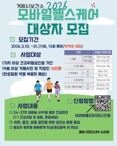 모바일 헬스케어사업 관련한 자세한 사항은 거제시보건소 건강증진과 통합건강관리실로 문의하면 된다.
