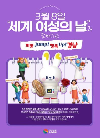 비즈데일리 이성화 기자 | 경상남도는 3월 8일 세계 여성의 날을 맞아 여성의 사회 참여 확대와 양성평등 사회 실현을 위한 다양한 정책을 추진하고 있다고 밝혔다.