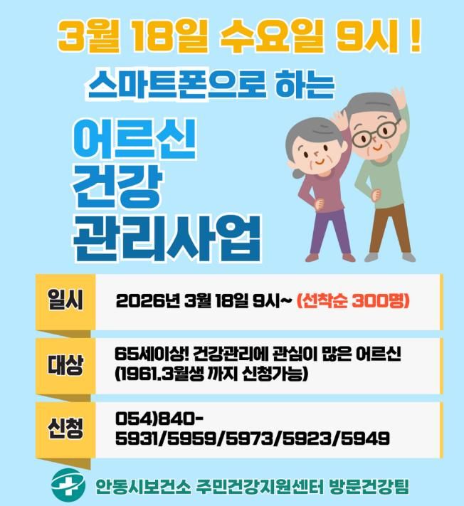 안동시는 오는 3월 18일부터 지역 내 65세 이상 어르신을 대상으로 ‘AI·IoT 기반 어르신 건강관리사업’ 참여자를 모집한다고 밝혔다.