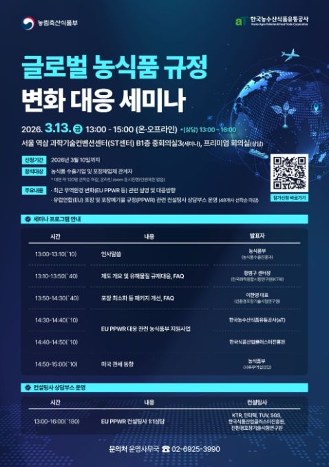 이번 세미나는 K-푸드 수출기업과 포장재 업계의 규정 대응을 지원하기 위해 마련됐으며, 오프라인과 온라인 생중계 방식으로 동시에 진행된다.