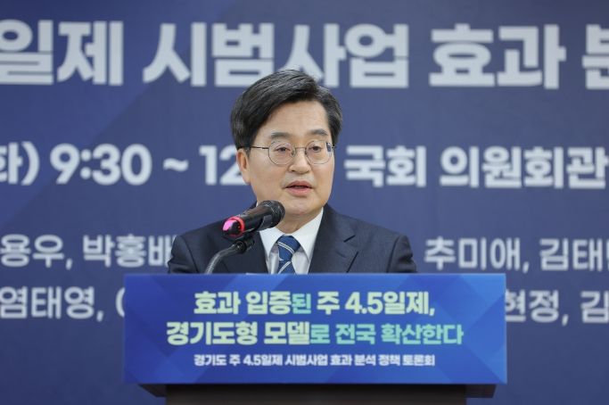 김동연 지사는 10일 국회 의원회관에서 열린 ‘주4.5일제 시범사업 효과 분석 정책 토론회’에 참석해 “주4.5일제는 단순한 근무시간 단축 정책이 아니라 일하는 방식과 삶의 균형을 다시 설계하는 사회적 실험”이라고 밝혔다.