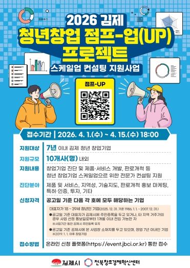 김제시가 청년 창업기업의 성장 단계 도약을 지원하는 ‘청년창업 점프-업(UP) 프로젝트’를 본격 추진한다.