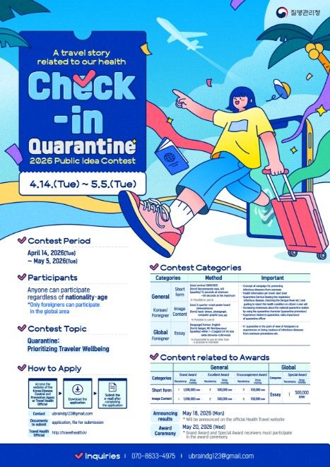 임승관 질병관리청장은 “이번 공모전을 통해 국민이 직접 참여하는 콘텐츠를 발굴하고, 건강한 해외여행에 대한 인식 개선과 예방 실천 문화를 확산할 수 있는 계기가 되기를 기대한다”며, “다양한 시선에서 제안된 의견을 콘텐츠로 활용하여 건강한 해외여행 문화를 확산해 나가겠다”고 밝혔다.